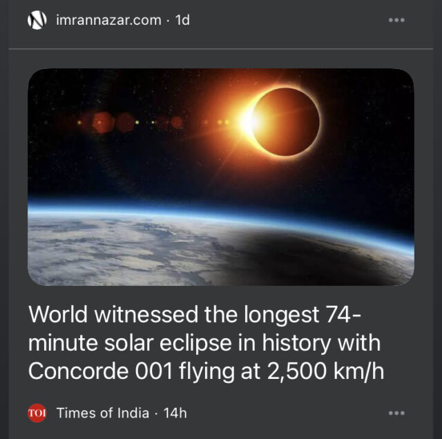 The plan was to intercept the moon’s shadow over the Sahara Desert in Mauritania and then race along the path of totality at the Concorde’s cruising speed of 2,500 km/h (about Mach 2.06).