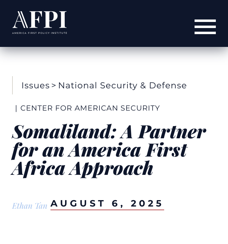 Warbixin dhowaan ka soo baxday machadka America First Policy Institute (AFPI) ayaa ku boorineysa Maraykanka inuu xoojiya xiriirka uu la leeyahay Somaliland. Qoraalkan, oo uu daabacay Ethan Tan 6-da Agoosto 2025, wuxuu ku andacoonayaa in Washington ay Somaliland u aragto dowlad-deganaan leh oo lagu kalsoonaan karo si loo gaaro danaha Maraykanka ee qaaradda Afrika. Waa kuwan qodobbada ugu muhiimsan.